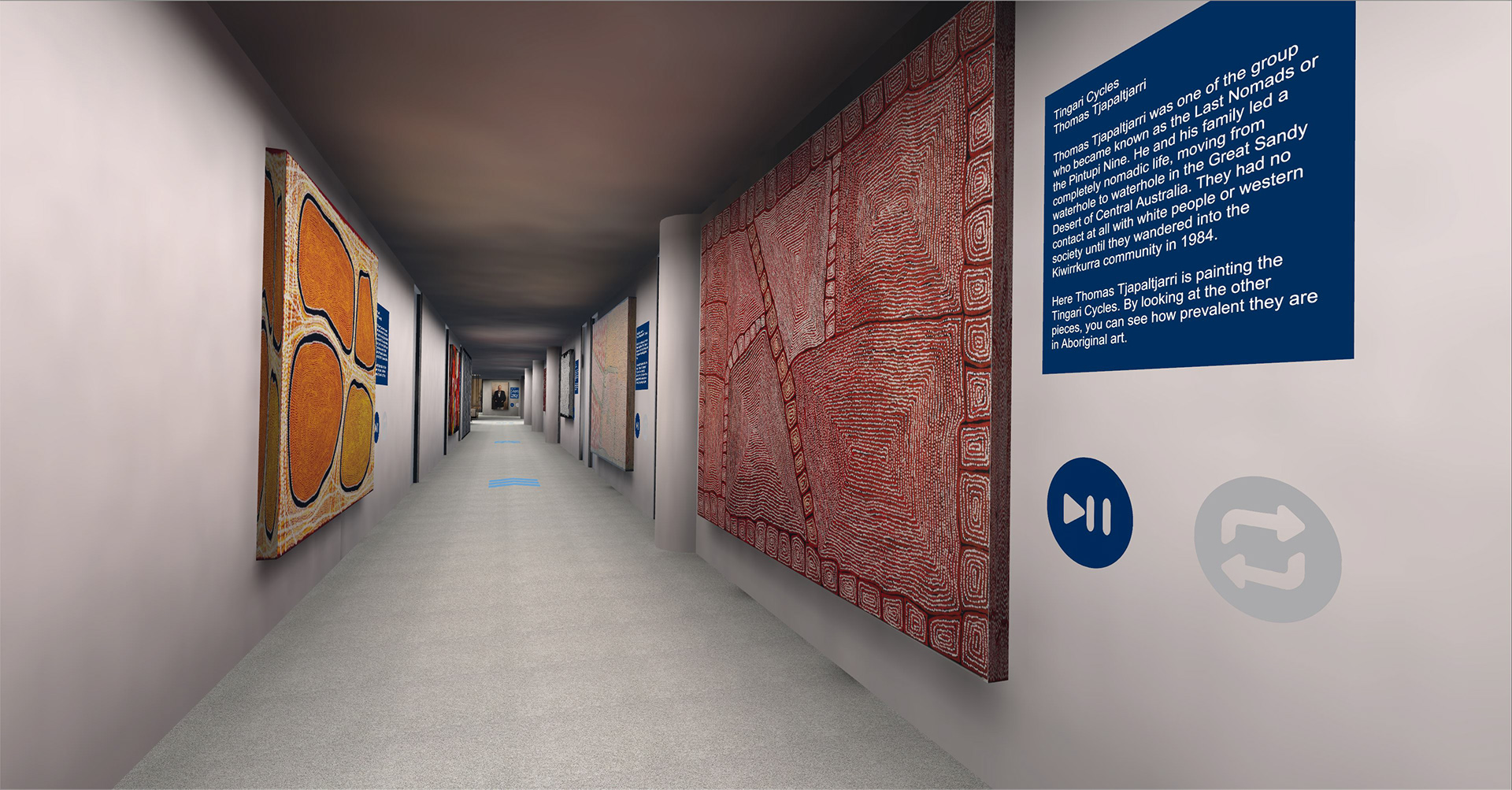 The project brief for this assignment was to create an interactive experience integrating emerging technologies. I chose to develop an interactive virtual reality art tour of the Corrigan Walk at Bond University. The Corrigan Walk is Australia's largest private collection of indigenous artworks on public display, located within the newly constructed health sciences building on the Bond University campus.